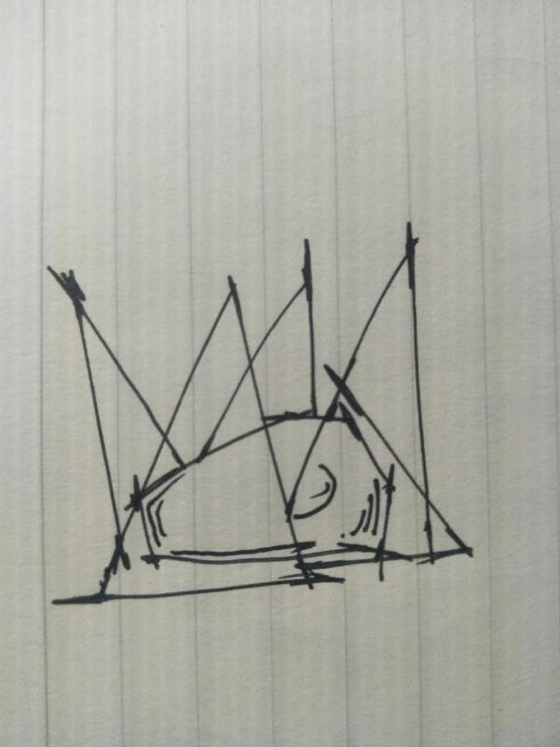 本次設(shè)計(jì)靈感源出于假山碎石掉入池中水平面濺起的一瞬間畫面。 將飛馳的水珠幾何化簡(jiǎn)為角形,意欲營(yíng)造冬季結(jié)冰時(shí)的形狀。荷花則迎夏,與之呼應(yīng),將本不該同時(shí)出現(xiàn)的兩種情景通過(guò)一靜一動(dòng)相結(jié)合。