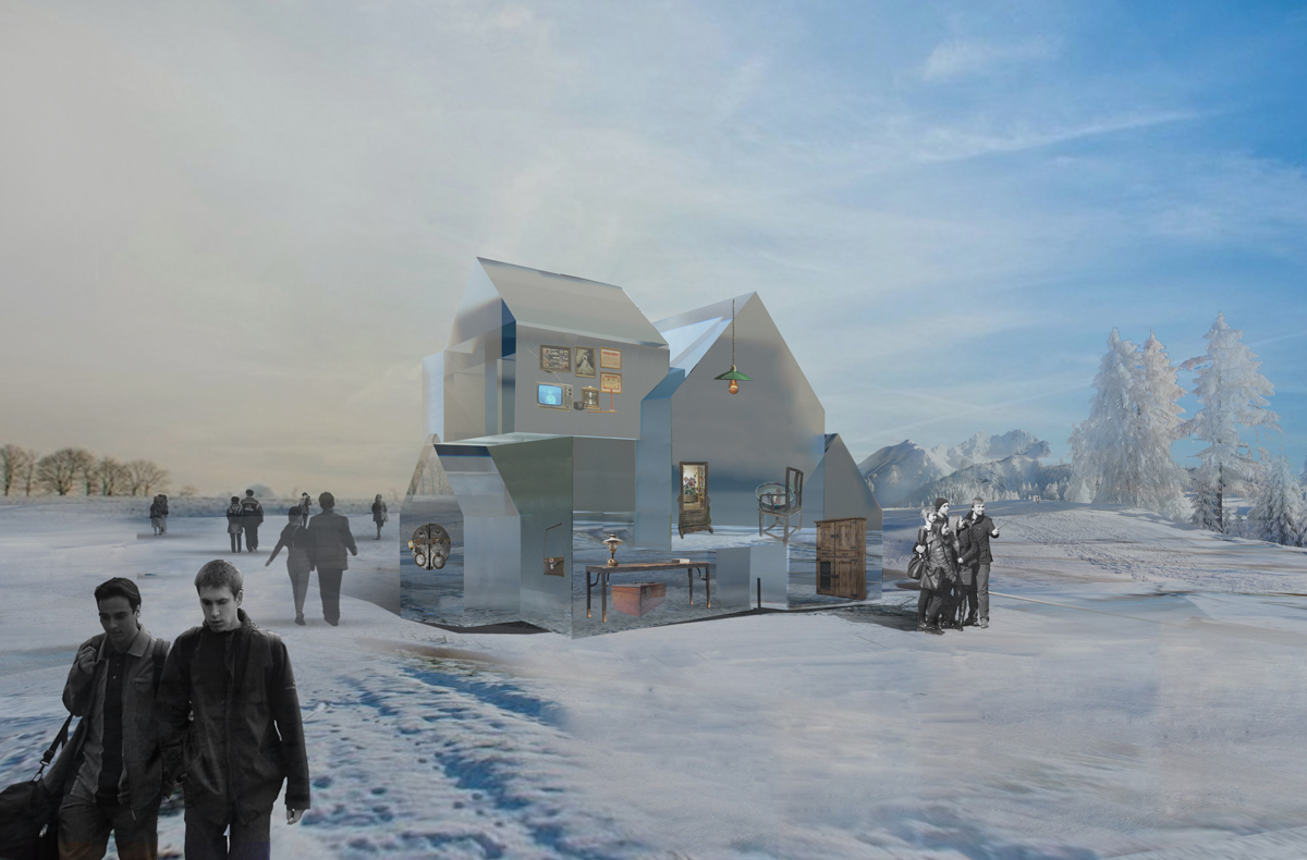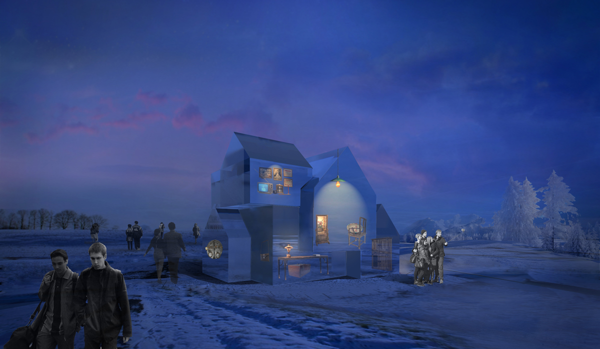 運用“冰”封存的材料語言,將懷有記憶的老物件鑲嵌于極簡的建筑形態(tài)的冰塊中,燈光與有“溫度”的物件構(gòu)成了記憶中家的溫馨場景。我們希望借此作品能勾起觀眾的記憶。