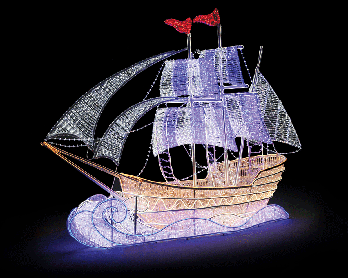 該產(chǎn)品外形美觀,動感強烈,所有船帆鼓風破浪前行,寓意順風順水,一帆風順。產(chǎn)品采用高亮度LED燈體制作而成防水性好,亮度高、耗電量低,節(jié)能環(huán)保。廣泛應用于各種燈光節(jié)、公園、商業(yè)廣場、酒店大堂等場所作為景觀造型裝飾燈飾。