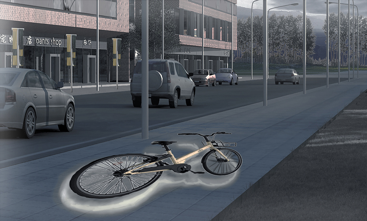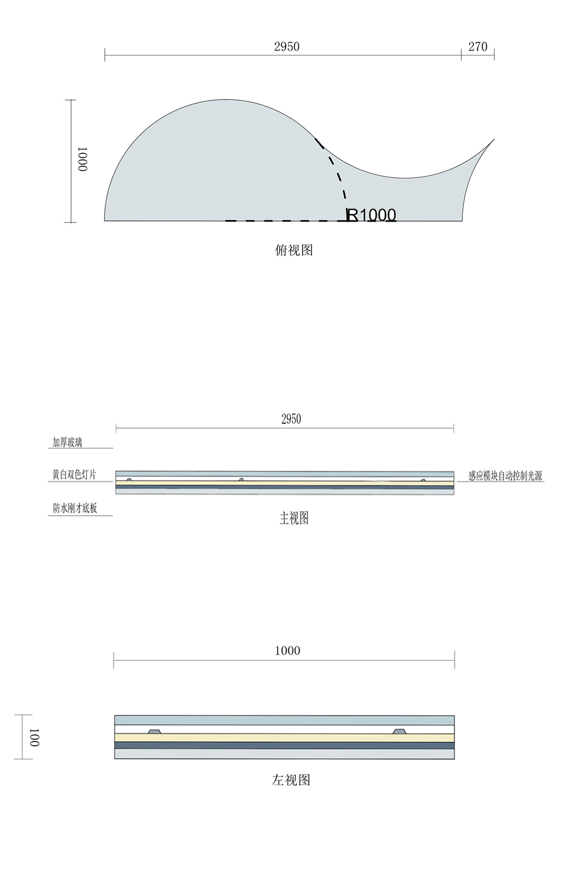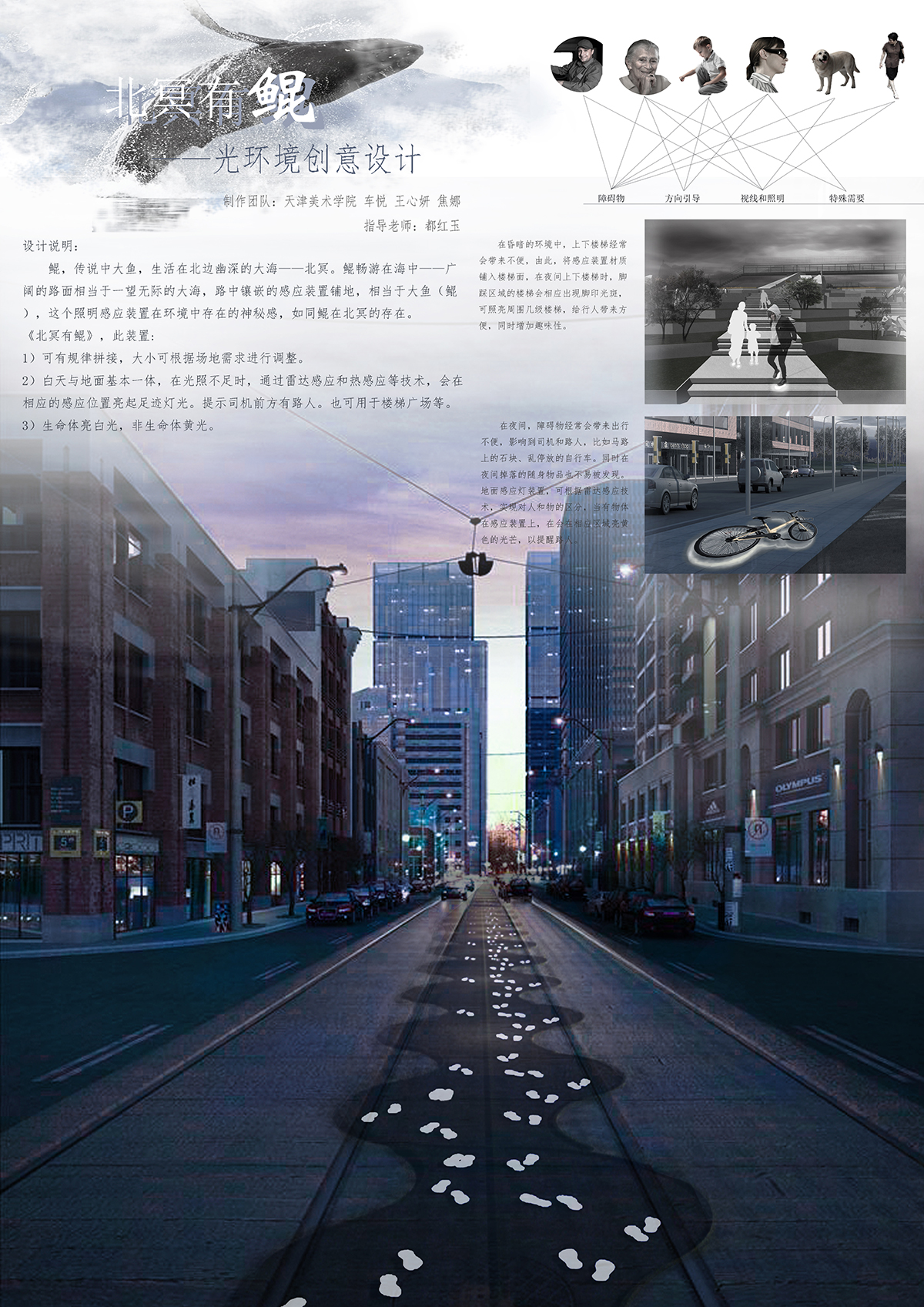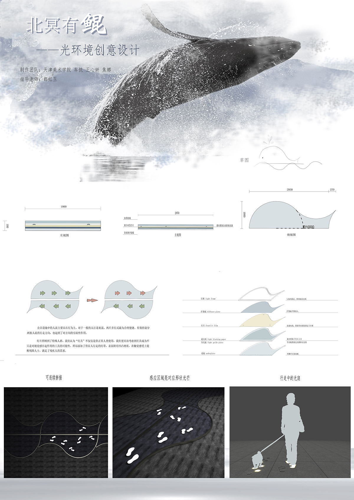 鯤,傳說中的大魚,生活在北邊幽深的大海北冥之中。在我們的設計中廣闊的路面亦如一望無際的大海,路中鑲嵌的感應裝置鋪地,相當于大魚(鯤),這個照明感應裝置在環(huán)境中存在的神秘感,如同鯤在北冥的存在。人們行走期間,與鯤感應互動,與城市海洋共呼吸。在保障道路安全的同時,重構親和生動的城市街景燈光。