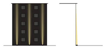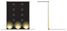 窄光束投光燈方案:水平方向易形成強(qiáng)烈的明暗對比。必須縮小燈具之間的距離、增加燈具數(shù)量才能改善這一問題。 |