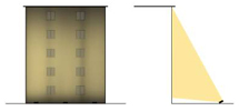 使用泛光燈方案:為了增加墻面的垂直均勻度,增加了與墻面的距離,但大大降低了照度水平,必須增加光源的功率才能解決。 |